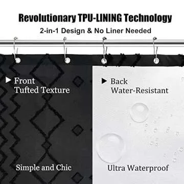 Show moreTransform your bathroom into a serene retreat with the NixiYa Black Shower Curtain. Measuring a substantial 72 x 78 inches, this elegant shower curtain is designed to fit most tub and shower spaces seamlessly. With its modern boho style, this shower curtain combines functionality and aesthetics, bringing a touch of shabby chic charm to your home. Crafted from double-layered fabric, it features a unique tufted chevron design that not only looks stunning but also enhances your bathing experience.