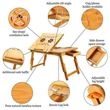 Nnewvante Laptop Desk Super Top Laptop Table 100% Bamboo Desk Adjustable with USB Fan2 Foldable Breakfast Serving Bed Tray Drawer