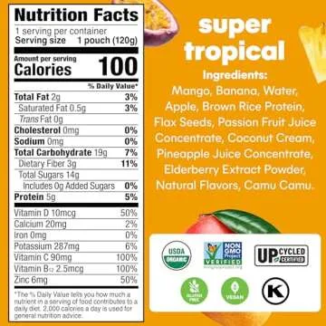 With every pouch, you receive a powerhouse of nutrients designed to support your well-being. Each serving boasts 5g of plant protein and contains 600mg of omega-3 from flaxseed, contributing to immune support and overall health. Each smoothie is fortified with a rich Vitamin & Mineral blend, providing 100%DV of Vitamin B12 & Vitamin C, as well as significant portions of Vitamin D and Zinc. It’s a snack that fuels your body and boosts your immune system, making it a smart choice for anyone on the go!