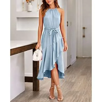 Show more Introducing the Elegant Wedding Guest Dress, a masterpiece of style and comfort crafted from exquisite satin fabric. This beautiful dress is designed for the modern woman who seeks a blend of elegance and casual wear. With its stunning high-low cut and ruffle hemline, it creates a dreamy silhouette that flows gracefully as you move. The classic halter neck design adds a touch of allure and sophistication, making it suitable for a variety of occasions. Available in an array of colors including Dark Blue, Army Green, and Rose Red, this dress is versatile enough to be a centerpiece in your wardrobe.