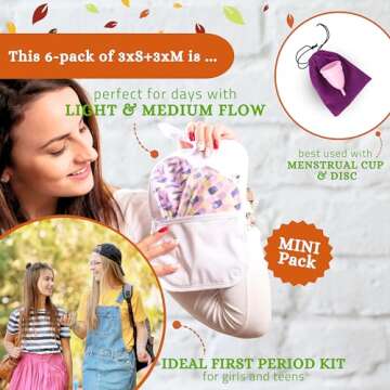 Non Slip Cloth Menstrual Pads Light Flow 6-Pack (S+M) Organic Cotton Washable Pads Menstrual for Women and Teens & Cloth Pads Menstrual Light Flow, Small & Medium Reusable Period Pads