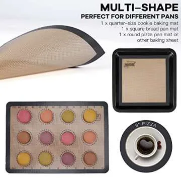 Featuring three versatile size options—an 11.8'' x 8'' quarter-size mat, an 8” x 8” square cake mat, and a 9'' diameter round cake/pizza mat—this set caters to all your baking needs.