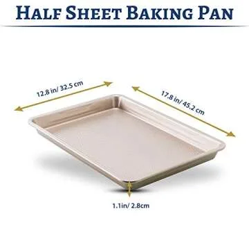 Show more Introducing the perfect baking companion for every home chef, the Ultra Cuisine Nonstick Half Sheet Baking Pan! This remarkable kitchen essential is designed to help you achieve PERFECT BAKING, EVERY TIME. With its unique diamond textured baking surface that promotes even airflow distribution, you'll enjoy flawlessly baked cookies and proteins with a deliciously golden finish every time. Measuring at a generous size of 17.8 x 12.8 x 1.1 inches externally and 17.4 x 12.4 x 0.9 inches internally, this nonstick baking pan can handle a wide range of recipes, making it your go-to baking solution.