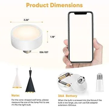 Show more Illuminate your spaces effortlessly with the NookNova 2 PCS Battery Operated Light Bulbs. Designed for practicality and convenience, these innovative light bulbs allow you to enjoy bright lighting without the constraints of wiring or power outlets. Each bulb comes with a remote control, making it easy to switch on/off or adjust brightness from anywhere in the room. Perfectly crafted to fit standard E26 sockets, these LED puck lights are ideal for illuminating areas where conventional electric fixtures cannot reach, such as wall sconces and pendant lights in any corner of your home.