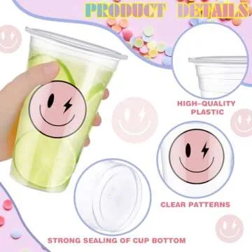 Norme 52 Sets Smile Face Plastic Cups with Lids 16 oz Clear Disposable Iced Coffee Cups with Colorful Stripes Paper Straws for Cold Drinks Birthday Bachelorette Party Drinkware