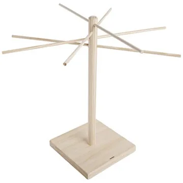 Its design features four 18-inch dowels that effortlessly slide through well-placed holes in the post, creating eight arms arranged at ideal angles. This thoughtful construction prevents any interference between drying strands, allowing even the longest fettucine to hang freely. The unfinished wood helps grip your pasta, preventing it from slipping off the arms, ensuring every strand dries perfectly.