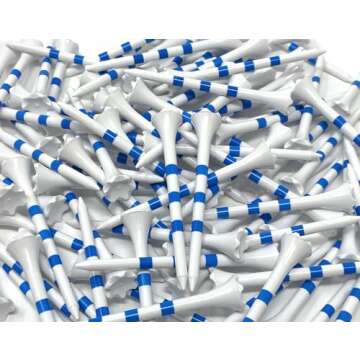 The golf tees primarily come in a white color with three blue stripes for visibility.