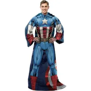 Show moreExperience comfort and superhero fun with the Marvel's Captain America 'First Avenger' Blanket! Crafted from 100% polyester, this blanket embodies the spirited essence of Captain America, featuring an eye-catching 'First Avenger' design. Measuring 48-inches by 71-inches, it offers ample coverage to keep you warm and cozy. Designed with functionality in mind, it includes a strategically placed opening in the back, ensuring full coverage in the front while allowing easy movement with its long sleeves. Whether you're lounging at home or indulging in a movie marathon, this blanket is perfect for staying warm without compromising on style. Moreover, it’s machine washable, making it easy to keep clean and maintain. The Captain America Blanket is not just a practical item; it's a statement piece for all Marvel enthusiasts, combining warmth, comfort, and a touch of superhero magic for an unbeatable lounging experience.