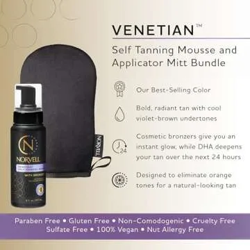 Show moreDiscover the secret to a stunning, sun-kissed glow without the harmful effects of UV exposure with the Norvell Sunless Self Tanning Bundle. This comprehensive package features the Venetian Self Tanner Mousse with Bronzer and a Streak-Free Tan Applicator Mitt, providing you with everything you need to achieve a flawless and natural-looking tan. Packed in an 8 Fl Oz bottle, the mousses rich formula combines violet and brown tone bronzers to ensure your skin radiates with a stunning golden hue that's never orange or artificial. The specially formulated tanning foam goes on smoothly, creating a seamless application that develops into a beautiful, even tan. With decades of experience in sunless tanning, Norvell understands the importance of quality and performance, ensuring you step out with confidence every time.