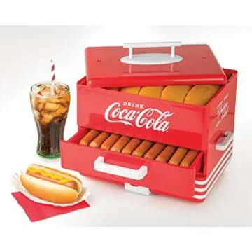 Show more Introducing the Nostalgia HDS248COKE Coca-Cola Hot Dog Steamer - the ultimate kitchen companion for hot dog enthusiasts! This diner-style hot dog steamer can effortlessly cook up to 20 hot dogs at a time, making it perfect for parties, family gatherings, or simply a weekend BBQ. Not only does it steam hot dogs, but it can also handle breakfast sausages, bratwursts, vegetables, fish, dumplings, and more, providing culinary versatility that will delight any foodie.