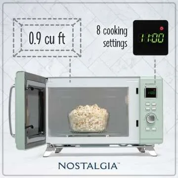 Show more Introducing the Nostalgia Mid-Century Retro Countertop Microwave Oven, a perfect blend of vintage charm and modern practicality! With an impressive 900 watts of cooking power and a spacious capacity of 0.9 cubic feet, this microwave is designed to efficiently cook and reheat your favorite foods in a flash. Whether you’re popping popcorn for a movie night or reheating last night’s dinner, the customizable cooking options will ensure your meals are prepared to perfection. Featuring 8 pre-programmed settings, including options for pizza, vegetables, and meat, this microwave takes the guesswork out of cooking, allowing you to enjoy delicious meals quickly and conveniently.