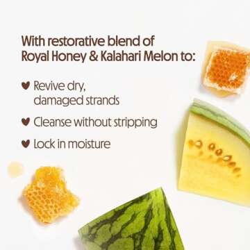 Our conditioner complements the shampoo, deeply conditioning and helping to mend damaged strands, leaving hair feeling soft, smooth, and revitalized. With 98% naturally derived ingredients and dermatologist-tested, this formula incorporates a restorative blend of Royal Honey and Kalahari Melon to ensure deep nourishment for your hair.