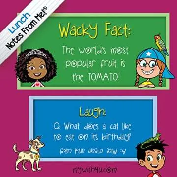 Show moreIntroducing the Notes From Me! 101 Tear-Off Lunch Box Notes for Kids, the ultimate way to blend fun with learning during lunchtime! Each vibrant 4" x 4" note is expertly crafted to provide children with an engaging mix of wacky facts and hilarious jokes. Designed to spark curiosity, these notes not only aim to educate but also to invoke smiles and laughter at every mealtime. Say goodbye to dull lunches and hello to a daily dose of joy as your kids discover new facts about the world paired with giggles that brighten their day!
