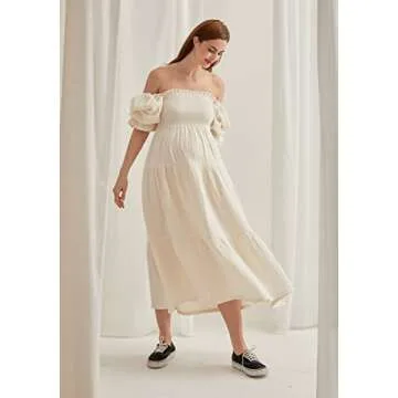 NOTHING FITS BUT Kiko Baby Shower Maternity Gown, Women’s Cotton Modal Classic Linen Smocked Nursing Dress, Short Puffed Sleeves, Off Shoulder, Ruffled Details, Medium, Cream