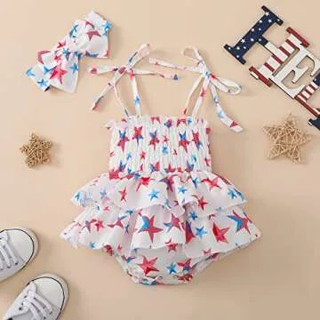 Designed with an eye-catching stars and stripes motif, this dress features lacing spaghetti straps, pleated detailing, and backless ruffle layered patchwork. The clear red and white American flag stripe print is complemented by sweet bowknots on the straps, epitomizing sartorial charm fit for a little princess. Its non-see-through construction and breezy fit ensure that your toddler will not only look cute but remain comfortable all day long during various occasions.