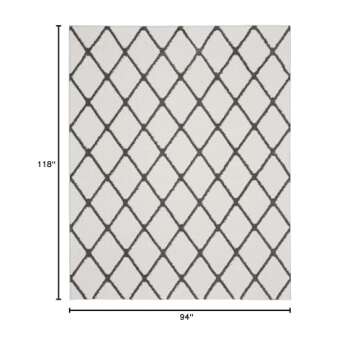 Show more Transform your living space with the Nourison Feather Soft Trellis Area Rug, an exquisite blend of style and functionality. This stunning rug features a modern high-low trellis pattern beautifully crafted in shimmering charcoal grey and ivory, making it an eye-catching centerpiece for any room. Measuring 7'10" x 9'10", it is made from machine tufted polyester microfiber which offers an ultra-soft touch underfoot.