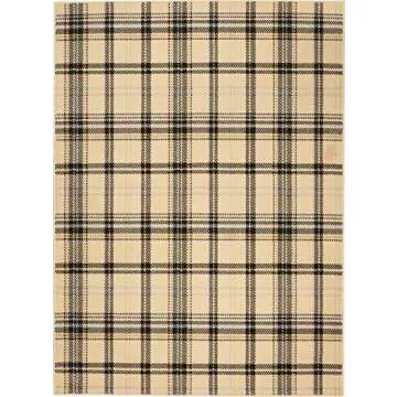 This rug features a cream and black plaid design, making it versatile for any decor.