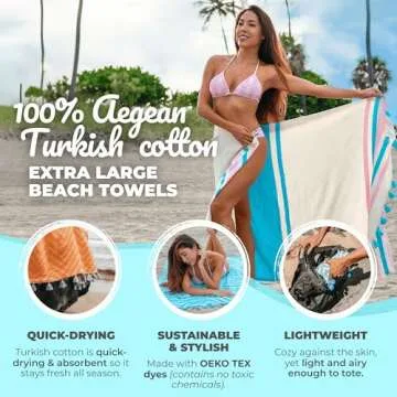 Show moreIntroducing the Nova Blue Turkish Beach Towel, the ultimate combination of style, functionality, and comfort that every beach enthusiast deserves. This lavish towel is crafted from 100% Aegean Turkish cotton, renowned for its plush softness and enhanced absorbency. Measuring a generous 37 x 71 inches, it provides adequate coverage for lounging on the sand or wrapping yourself up after a swim. Available in stunning pink stripes with playful pom-pom tassels, this towel is designed to turn heads and make your beach days more fashionable and enjoyable. Beyond its eye-catching aesthetics, the Nova Blue towel serves double duty as a quick-drying blanket, ensuring you're always cozy at summer picnics or yoga sessions in the park.