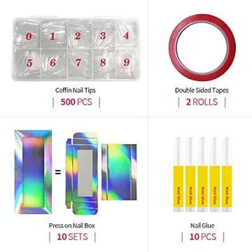 Show more Transform your nail game with our comprehensive Nail Art Essentials Kit! This kit features high-quality nails boxes crafted from durable paper and plastic material, ensuring that your nails are kept free from dust while being completely safe for use. Each box is designed for both professional and personal use, making it ideal for press-on nail shop owners and DIY enthusiasts alike. The nail tips in this package are made of premium ABS material that guarantees breathability, lightness, and durability, creating a naturally appealing look for your nails. You’ll receive a generous 500 pieces in one package, providing you with ample supplies to unleash your creativity.