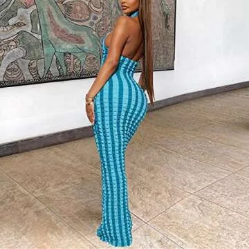 Step into sophistication with the Novaorily Women's Casual Sexy Halter Sleeveless Sundress—a stunning addition to your formal and casual wardrobe. This eye-catching bubble-textured backless maxi dress is designed to highlight your curves while ensuring maximum comfort. Crafted with a blend of 95% polyester and 5% spandex, this dress is breathable, stretchy, and lightweight, making it the perfect choice for warm weather or elegant evenings. Whether you're attending a wedding, a formal dinner...
