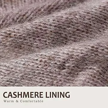The lining of each glove is made from 100% ultra-warm knitted cashmere, ensuring that your hands remain cozy and dry throughout the day. This remarkable blend of materials guarantees excellent heat retention and air permeability, giving you the freedom to use your hands effortlessly without compromising on warmth.