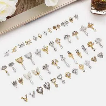Noverlife 48PCS 3D Bow Nail Art Charms Rhinestones, Luxury Metal Crystal Diamonds with Pearls for Nail Design, Dazzling Heart Butterfly Pendant Gems for DIY Salon Manicure Decoration Jewelry Crafting