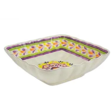 Hand Blown Multicolor Ceramic Serving Bowl - Square Mexican Lavender by NOVICA