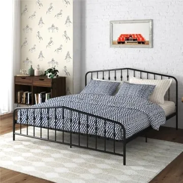 Show moreThe Novogratz Bushwick Modern Metal Bed Frame seamlessly combines style and function, showcasing a striking black finish that transforms your bedroom into a chic oasis. With its sleek design featuring a slightly triangular headboard and footboard adorned with inset spindles, this bed not only enhances your room’s aesthetic but also provides ample support for your mattress without the need for a bulky box spring. The platform's sturdy construction results in a solid sleeping experience, perfect for restful nights and rejuvenating mornings.