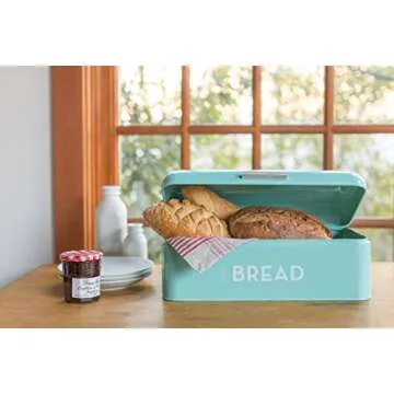Show moreIntroducing a stunning addition to your kitchen – the Now Designs Retro Bread Box! This beautifully crafted bread box isn’t just a storage solution; it’s a stylish statement piece that transforms your countertop. Made from powder-coated steel, it boasts a vibrant turquoise color complemented by bold white lettering, breathing life into any kitchen decor. The small ventilation holes at the back ensure optimal air circulation, keeping your bread fresh and delicious for longer periods.