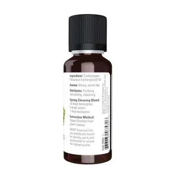 NOW Essential Oils, Lemongrass Oil, Uplifting Aromatherapy Scent, Steam Distilled, 100% Pure, Vegan, Child Resistant Cap, 1-Ounce