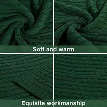 Show more Introducing the NTBAY 100% Pure Cotton Cable Knit Throw Blanket, a true embodiment of comfort and style. Crafted from premium quality cotton, this throw blanket measures 51 x 67 inches, making it the perfect addition to your couch, sofa, chair, or bed. Its exquisite cable knit design not only adds a touch of elegance to your home decor but also provides superior warmth and coziness, enveloping you in soft luxury. Available in a beautiful dark green shade, this blanket suits a variety of home aesthetics while doubling as a versatile accent piece.