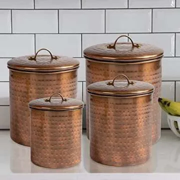Show more Introducing the NuSteel Hammered Antique Copper Stainless Steel 4pc Canister Set, a perfect blend of elegance and utility designed to enhance your kitchen experience. These canisters are practical yet stylish, making them a fantastic addition to any countertop, whether in your home kitchen, a quaint bistro, or a bustling café. Crafted from high-quality stainless steel and adorned with a stunning antique copper finish, each canister is not only a storage solution but also a beautiful piece of décor. With meticulous hand-hammered craftsmanship, these canisters boast durability and a vintage charm that will elevate any space.