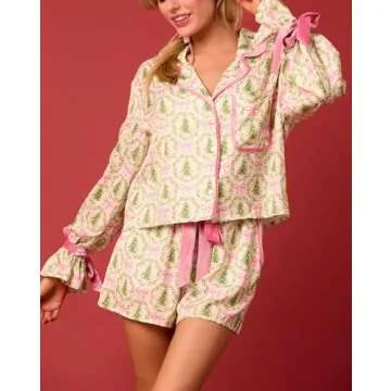 Show moreEmbrace the warmth and magic of the festive season with the NUFIWI Christmas Cute Bow Pajama Sets. Crafted from a luxurious blend of 97% polyester and 3% spandex, these pajamas are designed to offer a delightful silky feel against your skin. The set features a charming, whimsical print that elevates the cozy vibe, making it perfect for snuggling up by the fire or hosting a pajama party. The button-down shirt boasts a timeless classic notch collar, while the elastic waist shorts with contrasting trim provide a relaxed yet stylish look. Not only do they promise comfort, but they also bring a touch of holiday cheer with their adorable bow shoulder detail. Available in a lovely dark green hue, these pajamas are your go-to choice for relaxation during the holiday season and beyond.