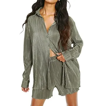 Introducing the NUFIWI Women 2 Piece Pleated Shorts Set, where modern comfort meets vintage flair in a stunning light green hue that captures the essence of the 90s. This stylish tracksuit set, made from soft, breathable polyester fiber, promises not just great looks but also all-day comfort. Whether you're lounging on the couch or stepping out for brunch, this chic 2-piece outfit allows you to stay stylish without sacrificing comfort. The button-down long sleeve shirt features...