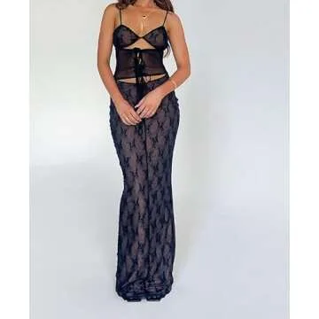 NUFIWI Women Lace Mesh See Through 2pcs Skirts Sets Sleeveless Crop Top and Long Skirt Matching Sets Night Club Party Suit