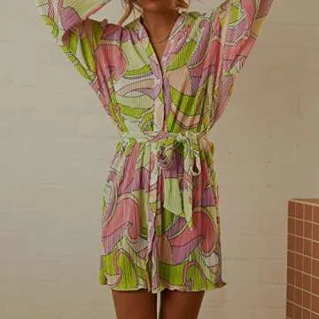 Show moreIntroducing the **NUFIWI Women Pleated Long Sleeve Mini Shirt Dress**, a delightful blend of comfort and style designed to elevate your summer wardrobe. Crafted from premium, breathable polyester fiber, this shirt dress promises a soft touch against your skin and a lightweight feel that makes it perfect for warm weather. Its unique **v-neck design** and **pleated embellishments** add a flirty touch while the **floral print** or solid colors ensure you stand out effortlessly. Tailored with **long flare sleeves** and a **ruffle hem**, this dress radiates a playful yet sophisticated vibe, making it a versatile choice for various occasions.