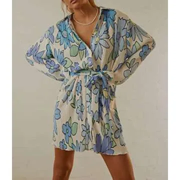 Show moreStep into elegance and comfort with the NUFIWI Women Pleated Mini Shirt Dress! This stunning long sleeve button-down dress is designed to cater to your fashion-forward needs while ensuring you feel confident and sexy. Made from high-quality fabric, this belted tunic blouse dress features a unique blue print that's both eye-catching and versatile. Whether you're dressing up for a casual outing or planning a day at the office, this dress effortlessly merges style with practicality.