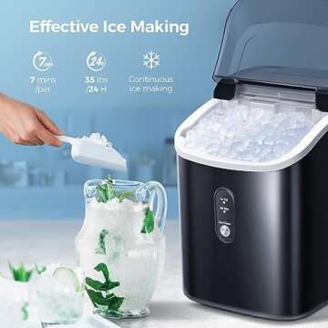 Show more Introducing the Crzoe Ice Maker, a revolutionary appliance that transforms your drink experience with its outstanding capabilities. This compact nugget ice maker features a powerful dual turbo compressor that produces an impressive 35 lbs of ice daily, allowing you to enjoy refreshing beverages whenever you want. Imagine having the convenience of continuous ice production right at your fingertips, thanks to its generous 1.1L water tank that ensures you never run out of ice for parties, family gatherings, or just a quiet evening at home.