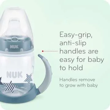 Introducing a revolutionary sippy cup that makes transition effortless and enjoyable for your little one. This product, designed with both functionality and safety in mind, provides a hassle-free way for toddlers to learn drinking from a spout. With its easy grip, anti-slip handles, your child can confidently hold the cup, promoting independent drinking skills. As they grow, these handles can be easily removed, adapting the cup to your child's evolving needs.