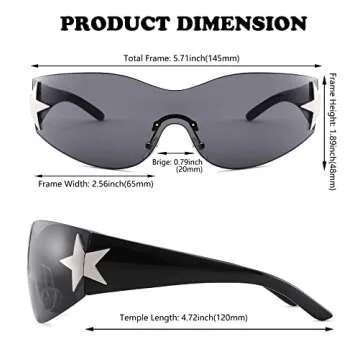 Show more Introducing the stunning Y2K Sunglasses, the must-have accessory for anyone looking to make a bold fashion statement! These trendy and fashionable sunglasses feature oversized one-piece lenses that wrap around the eyes, providing both style and protection. Highlighted by a unique pentagram-shaped accessory on the side, these glasses are designed to make you the center of attention wherever you go. Don't just wear sunglasses—wear a conversation starter!