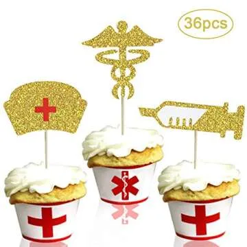 Nursing Cupcake Toppers - Nurse Graduation Cupcake Toppers - Medical RN BSN Nurse Week Themed Party Supplies - Nursing Cupcake Decorations - Gold Glitter, 36PCS