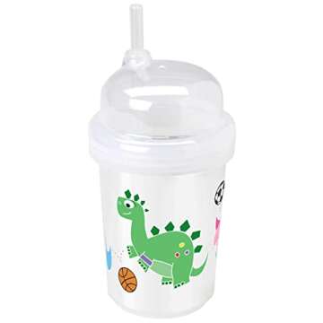Introducing the nuspin Kids 8 oz Zoomi Straw Sippy Cup in the delightful Sports Dinosaurs Style, a perfect blend of fun and functionality for your little ones! Designed specifically for children aged 12 months and older, this sippy cup is crafted from FDA Grade Silicone and Polypropylene, ensuring that it's not only safe but also durable for everyday use. The charming dinosaur design will encourage your kids to stay hydrated, making drinking a fun activity they will enjoy!