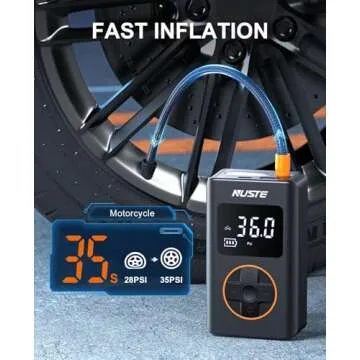 Show more The NUSTE quick inflation car tire inflator is an essential tool for any vehicle owner looking for efficiency and reliability on the road. This compact, lightweight device boasts a powerful metal motor that allows you to refill a standard car tire (195/55/R15) from 29-36 PSI in just 2 minutes. Gone are the days of long waits at a gas station; with the NUSTE inflator, you can quickly inflate your tires and be on your way without unnecessary delays.