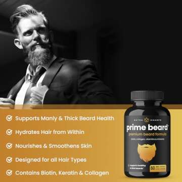 Why You Will Love This Product:Embrace the daily confidence that comes from sporting a thick, healthy beard. Prime Beard Vitamins not only enhance your physical appearance but also stimulate a sense of pride in your grooming routine. The positive impact of taking these vitamins extends beyond aesthetics; it reflects self-care and personal style, making you feel more manly and sophisticated. Experience the transformation as you stand out not just for your compelling looks, but for the effortless allure that comes with a well-cared-for beard.