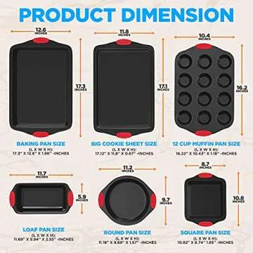 NutriChef 6-Piece Nonstick Bakeware Set - Carbon Steel Baking Tray Set w/ Heatsafe Red Silicone Handles, Oven Safe Up to 450°F, Loaf Muffin Round/Square Pans, Cookie Sheet, Baking Pan -NCSBS6S,Black