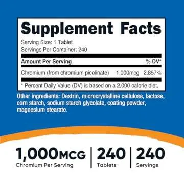 Show moreEnhance your overall health and wellness with Nutricost Chromium 1000mcg! Each tablet is meticulously formulated with 1,000mcg of chromium from high-quality chromium picolinate, ensuring that you're getting a potent dose designed for optimal absorption and efficacy. With 240 tablets packed in each bottle, you will have an ample supply to help support your dietary needs over an extended period. Not only does Nutricost prioritize quality, but our formulation is also non-GMO, gluten free, and soy free, catering to a variety of dietary preferences and restrictions. Rest assured, this supplement is crafted in a GMP compliant and FDA registered facility, highlighting our commitment to safety and quality.