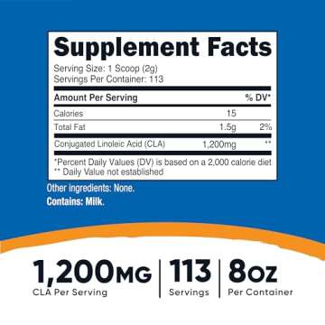 Show moreIntroducing the Nutricost CLA Powder, the ultimate companion for health-conscious individuals looking to enhance their wellness journey. Packed in a generous 8oz (227g) container, this supplement is designed to offer you the benefits of Conjugated Linoleic Acid with every scoop. With each serving delivering a powerful dose of 1,200mg of CLA, you'll have ample supply with 113 servings per container. Not only is it vegetarian-friendly, but it is also formulated without genetically modified organisms, making it suitable for those who are mindful of their dietary choices. Plus, it's gluten-free, ensuring it caters to individuals with gluten sensitivities or dietary restrictions, providing peace of mind with every use. Nutricost prioritizes your health, manufacturing this product in a GMP-compliant facility and subjecting it to rigorous third-party testing, ensuring that you receive a premium-quality supplement you can trust.