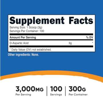 Show moreIntroducing the Nutricost D-Aspartic Acid (DAA) Powder 300G - your go-to supplement for boosting performance and overall wellness! This high-quality D-Aspartic Acid powder delivers a potent formula of pure D-Aspartic Acid without any binders or fillers, ensuring that you receive the best possible nutritional support. Each bottle contains an impressive 300 grams of D-Aspartic Acid, providing you with a generous 100 servings, allowing you to easily incorporate this powerful supplement into your daily routine. With a convenient 3-gram serving size, featuring a scoop included in every bottle, measuring out your dosage is a breeze. As a non-GMO and gluten-free product, Nutricost’s D-Aspartic Acid is designed to fit seamlessly into a variety of dietary preferences, making it a trusted choice for health enthusiasts.