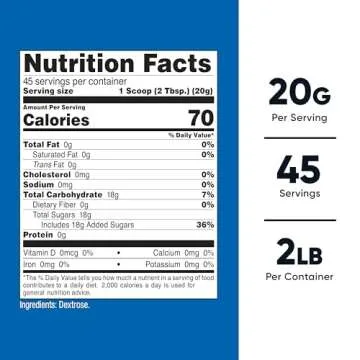 Show moreIntroducing the Nutricost Dextrose Powder 2 LBS, the ultimate carbohydrate source for athletes and health-conscious individuals alike! This premium dextrose powder delivers pure, simple carbohydrates with every scoop, making it the perfect addition to your post-workout recovery, performance optimization, or everyday energy needs. Each serving contains 20 grams of dextrose, allowing you to effortlessly replenish glycogen stores and support quick recovery after intense workouts. With no additional ingredients, it’s just dextrose powder crafted to fuel your body without any fillers or artificial additives. The convenient 2-pound bottle contains 45 servings, ensuring you'll have plenty on hand to keep your energy levels up and performance at its peak.