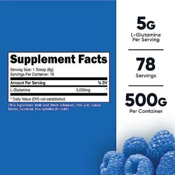 Show moreIntroducing the Nutricost L-Glutamine Powder in a delicious Blue Raspberry flavor, your ultimate companion for gut health and workout recovery. Each 500-gram bottle contains a generous 86 servings of high-quality L-Glutamine, providing you with 5 grams of pure glutamine per serving. This potent blend is perfect for anyone seeking a reliable supplement to support digestion and muscle recovery without any unwanted fillers or additives. The impressive quality is backed by our rigorous GMP compliant and FDA registered manufacturing process, ensuring you get only the best ingredients without gluten or GMOs.